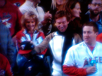 Everybody was at the game last night, even Wayne Gretzky. Apparently his kid is a Twins fan. Anybody know the reason behind that. I am guessing it involves Justin Morneau somehow. Also, sweet scarf Wayne.
